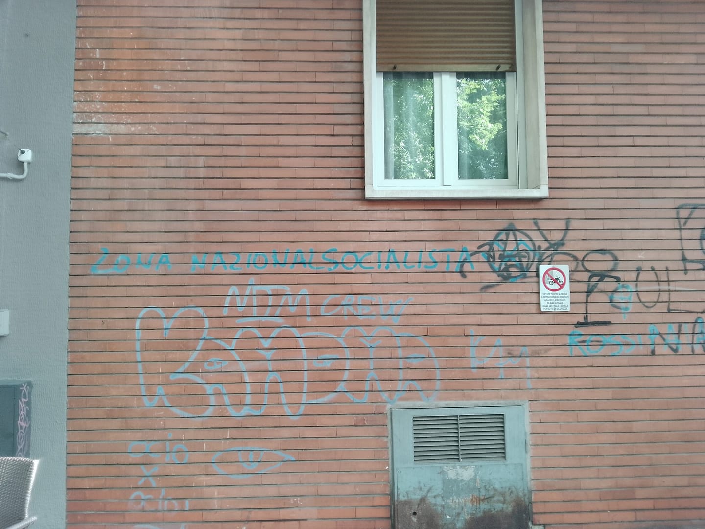 Grafit „Trieste appartiene a noi“ (Trst pripada nama) uz nacistički simbol naglašava prisvajanje prostora u nacionalnom smislu, isključujući sve druge zajednice koje su prisutne u gradu.